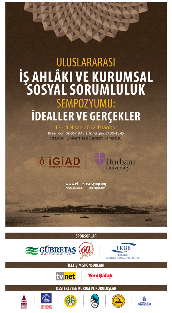 Uluslararası Konferans İş Ahlakı ve Kurumsal Sosyal Sorumluluk: İdealler ve Gerçekler Organizasyon: İGİAD İktisadi Girişim ve İş Ahlakı Derneği (İstanbul) ve Durham Üniversitesi İslami Ekonomi ve Finans Merkezi (Birleşik Krallık) Tarih: 12-14 Nisan 2012/ İstanbul Yer:...