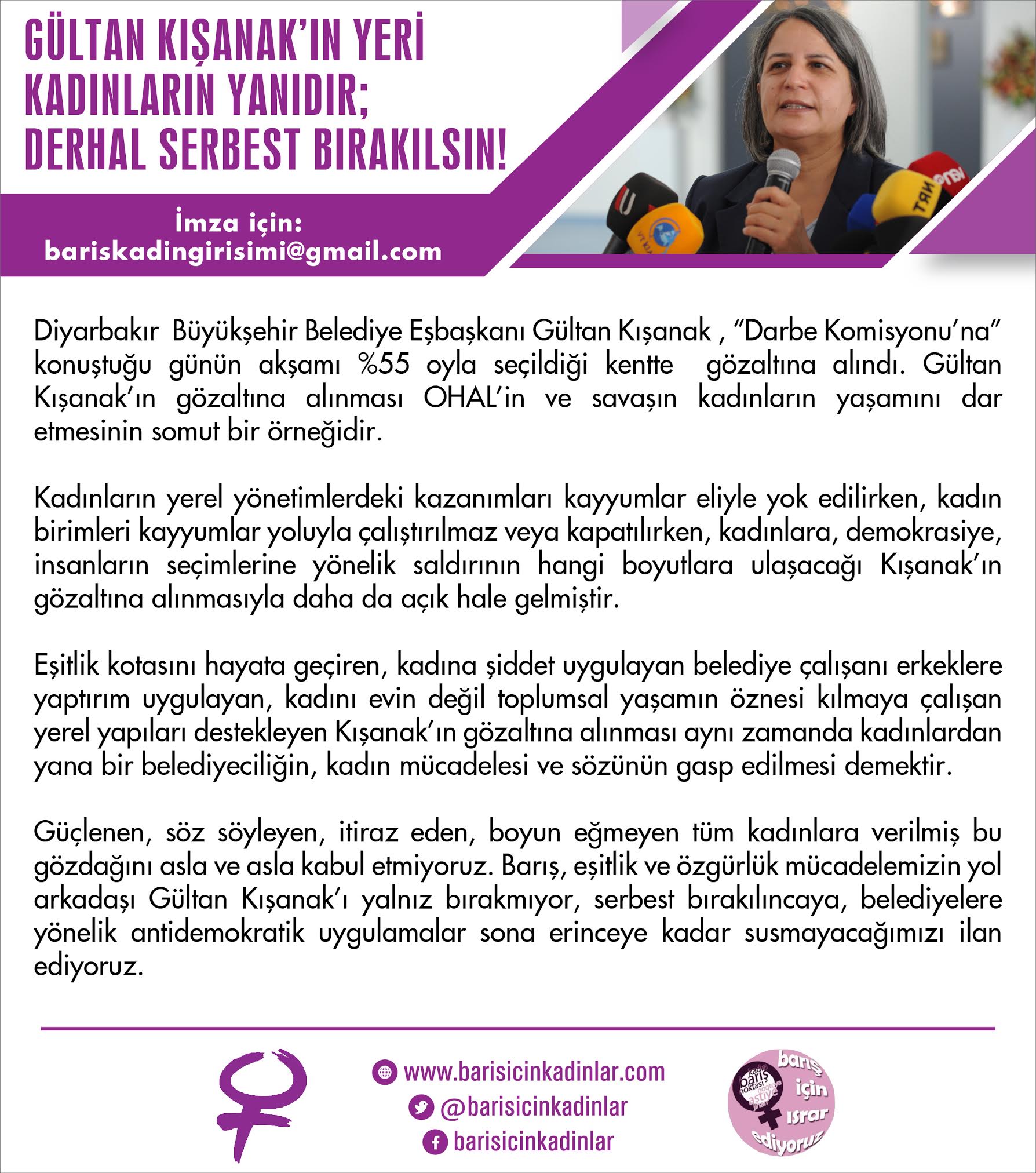 Emek ve Adalet Platformu’ndan kadınlar olarak yer aldığımız imza metnini sizlerle paylaşıyor ve 15 Temmuz’da söylediğimizi tekrar ediyoruz: Halkın iradesine karşı gerçekleştirilen bu darbe girişimini lanetliyoruz! Gültan Kışanak’ın yeri kadınların yanıdır; derhal serbest bırakılsın! Diyarbakır Büyükşehir...