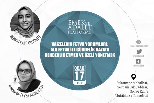 Burcu Kalpaklıoğlu Diyanet İşleri Başkanlığı’nın Alo Fetva Hattı’nda vaizelerin fetva sorularına cevap verdiği odada yürüttüğü saha çalışmasından yola çıkarak bize vaizelerin fetva verme pratiğini anlatacak. Feyza Akınerdem moderatörlüğünde yapılacak olan etkinlikte, Burcu Hanım, Boğaziçi...