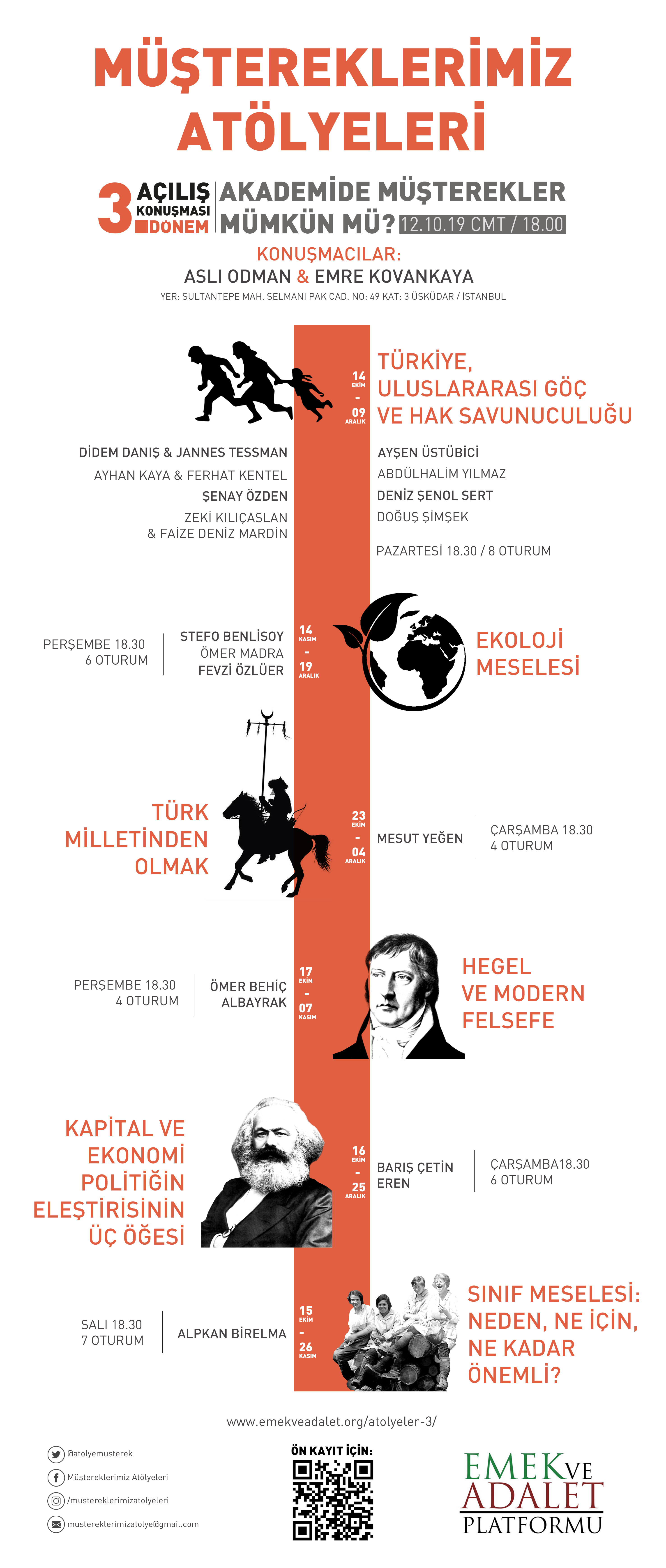 Müştereklerimiz Atölyeleri katılımcılarıyla birlikte insanlığın müşterek mirasını incelemek için 2018 yılında kuruldu. İnsanları ayıran, bir bölümünü diğerlerinden üstün gören, başkasının hakkına göz diken anlayışlara karşı güzel ahlakın, hürriyetin ve paylaşmanın bilgisini yaymak ve derinleştirmek için yola çıktığımız müştereklerimiz atölyelerinin üçüncü dönemini gerçekleştiriyoruz. Altı farklı atölye ile başlayacağımız 2019 Güz dönemine bekleriz.