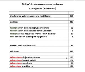 Aşağıdaki tabloda Ağustos ay sonu itibariyle Türkiye’nin uluslararası yatırım pozisyonunu görüyorsunuz. Dikkati önemli hesaplarda toplamak için bazı önemsiz hesapları göstermedim. Onun için varlık ve yüküm rakamları tek tek kalemlerin toplamını bir miktar aşmaktadır.