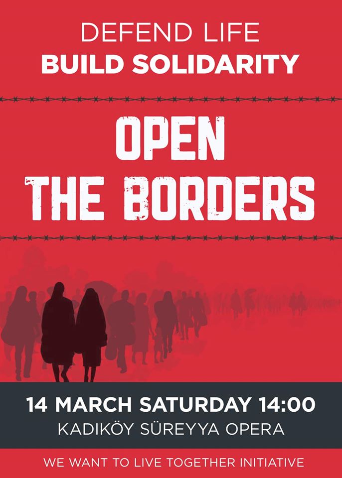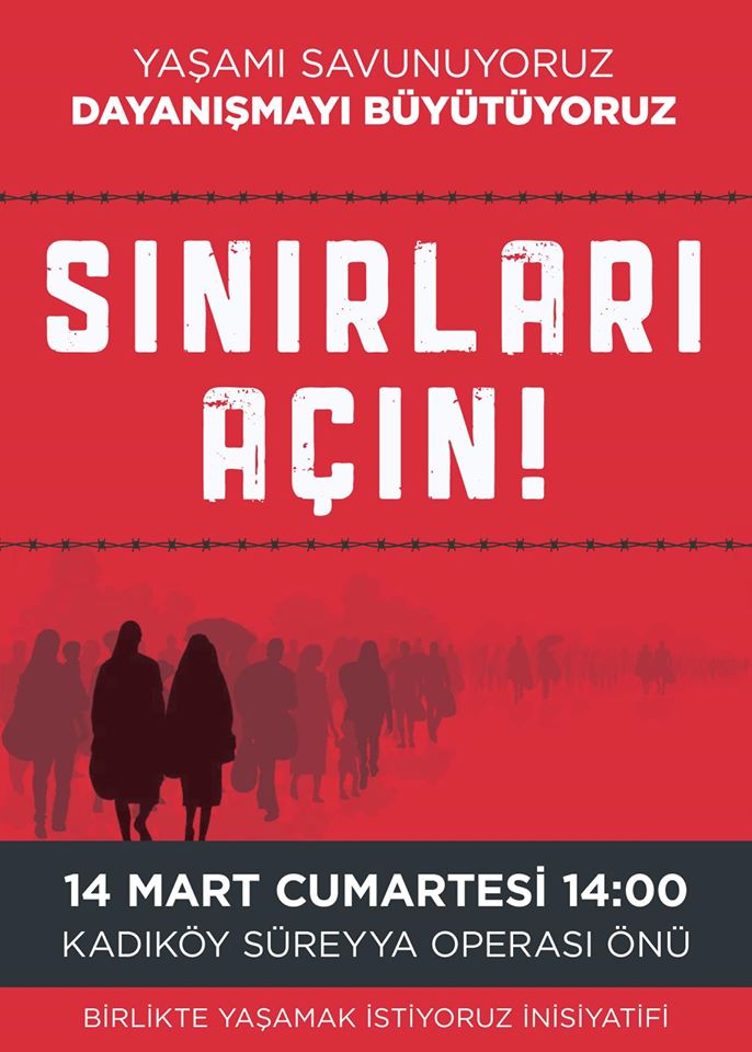 Birlikte Yaşamak İstiyoruz İnisiyatifi’nin çağrısıyla, 14 Mart Cumartesi, saat 14.00’te Kadıköy’de Süreyya Operası önünde göçmenlerin yaşadıkları sorunlara dair bir eylem tertiplenecek. Emek ve Adalet Platformu olarak bu çağrıyı destekliyor ve herkesi bu eyleme katılmaya çağırıyoruz.