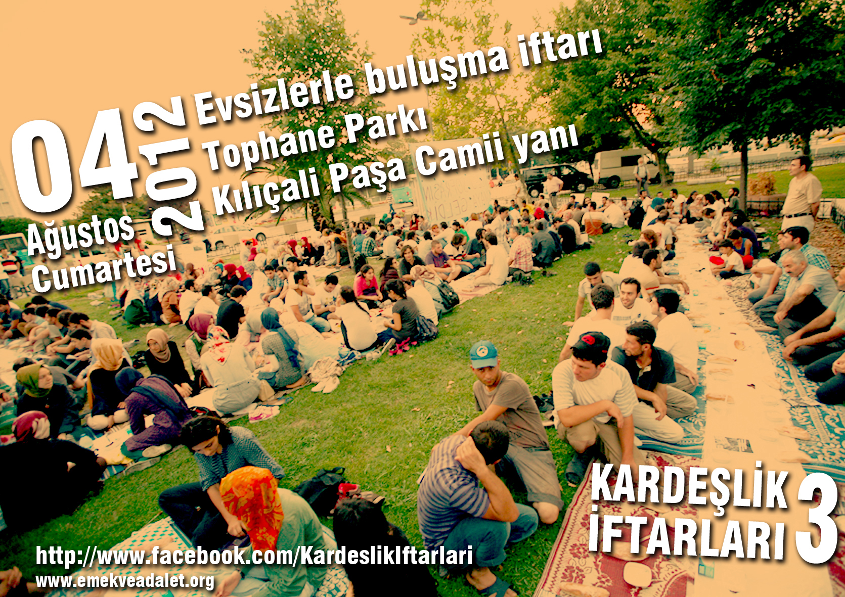 Geçen yılki iftar programlarımızda neye karşı olduğumuzu göstermiştik. Fakat çağrımız, yalnızca israfa karşı olmayı kapsamıyor. İnsanın insan olarak itibarını alaşağı eden bu üretim ve tüketim ilişkilerine hiçbir şekilde rıza göstermeyen bir ses yükseltmek istiyoruz. Bu seneki iftarlarda, neye karşı olduğumuz kadar, kimin yanında olduğumuzu da ifade etmek niyetindeyiz. İnsan sevdiğiyle beraberdir. Ramazan da şüphesiz bu beraberlik için bulunmaz bir vesile. Ramazan vesileyle toplumumuzdaki uçurumlardan birkaçına olsun temas etmek; işçi, evsiz ve göçmen abi, abla ve kardeşlerimizle birlikte iftar etmek için şöyle bir program yaptık: