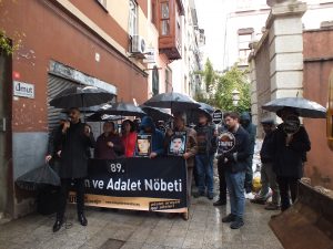 Dün 89. Vicdan ve Adalet Nöbeti için Taksim’de 1 Umut Derneği önündeydik. İş cinayetleri kader olarak görülmekten çıksın vurgusuyla başlayan nöbette basın açıklamasını 2008 Davutpaşa patlamasında eşini kaybeden İdris Çabuk okudu. İşçi ailelerinin Galatasaray Meydanı’na çıkmasının yasaklanışı sebebiyle 75. nöbetten itibaren nöbetlerini her ayın ilk pazarı saat 13:00’da 1 Umut Derneği önünde tuttuklarını söyleyen İdris Çabuk, “anayasal hakkımızı çiğneyen bu yasağın kaldırmasını istiyoruz” dedi.