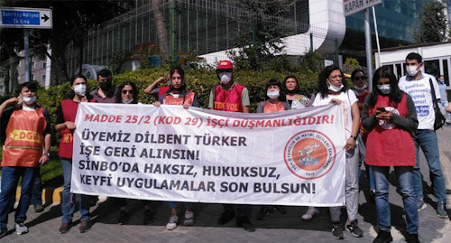 Kod-29’la işten çıkarılan Sinbo işçisi Dilbent Türker’in işe iade davasının ilk duruşması Bakırköy Adliyesinde görülürken TOMİS üyeleri ve direnişe destek olanlar adliye önünde dayanışmadaydı[5].