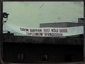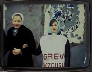 1970’lerin kooperatif deneyimi ve emek mekanlarını öne çıkaran Grev, Tekstil-iş Sendikasına bağlı kadın işçilerin çektiği bir adet film ve sanatçının çöpten bulduğu; direniş çadırları ve eylemleri gösteren bir dizi dia fotoğraftan oluşuyor. Kadın işçilerin çektiği filmleri bir araya getirdiği üç ayrı video düzenlemesi ise İlerici Kadınlar Derneği’nin kapatılmasına tepki olarak düzenlenen basın açıklamaları, TEKSİF’in 1977 Bakırköy Sümerbank grevi ve sanatçının 30 yıl adresine ulaşmayan PTT postalarının satıldığı bir mezattan aldığı ve militan bir kadın filmciye ait olan filmleri kendisine ulaştırma sürecine odaklanıyor.