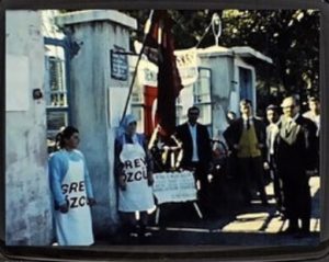1970’lerin kooperatif deneyimi ve emek mekanlarını öne çıkaran Grev, Tekstil-iş Sendikasına bağlı kadın işçilerin çektiği bir adet film ve sanatçının çöpten bulduğu; direniş çadırları ve eylemleri gösteren bir dizi dia fotoğraftan oluşuyor. Kadın işçilerin çektiği filmleri bir araya getirdiği üç ayrı video düzenlemesi ise İlerici Kadınlar Derneği’nin kapatılmasına tepki olarak düzenlenen basın açıklamaları, TEKSİF’in 1977 Bakırköy Sümerbank grevi ve sanatçının 30 yıl adresine ulaşmayan PTT postalarının satıldığı bir mezattan aldığı ve militan bir kadın filmciye ait olan filmleri kendisine ulaştırma sürecine odaklanıyor.