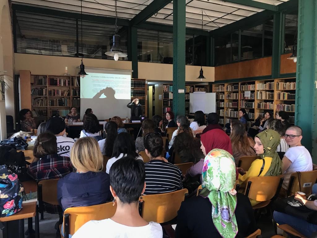 Son konuşmacı Fikriye Sarıgül kendi deneyimlerini ve şahit olduğu işyeri deneyimlerini bizimle paylaştı. Şiddetin normalleştirilmesinin, şiddet karşısında tepkisizliğin veya örgütlü tepkinin nasıl sonuçlandığına dair örnekler vererek örgütsüz, merdiven altı işyerlerinde kadın işçilere yönelik taciz, şiddet ve mobbingin daha fazla olduğunu anlattı. Ücretsiz emeğin, çocuk, hasta, yaşlı bakım yükümlülüklerinin kadınların üzerine bırakılmasının işyerlerinde kadınları daha tehlikeye açık hale getirdiğini belirtti.