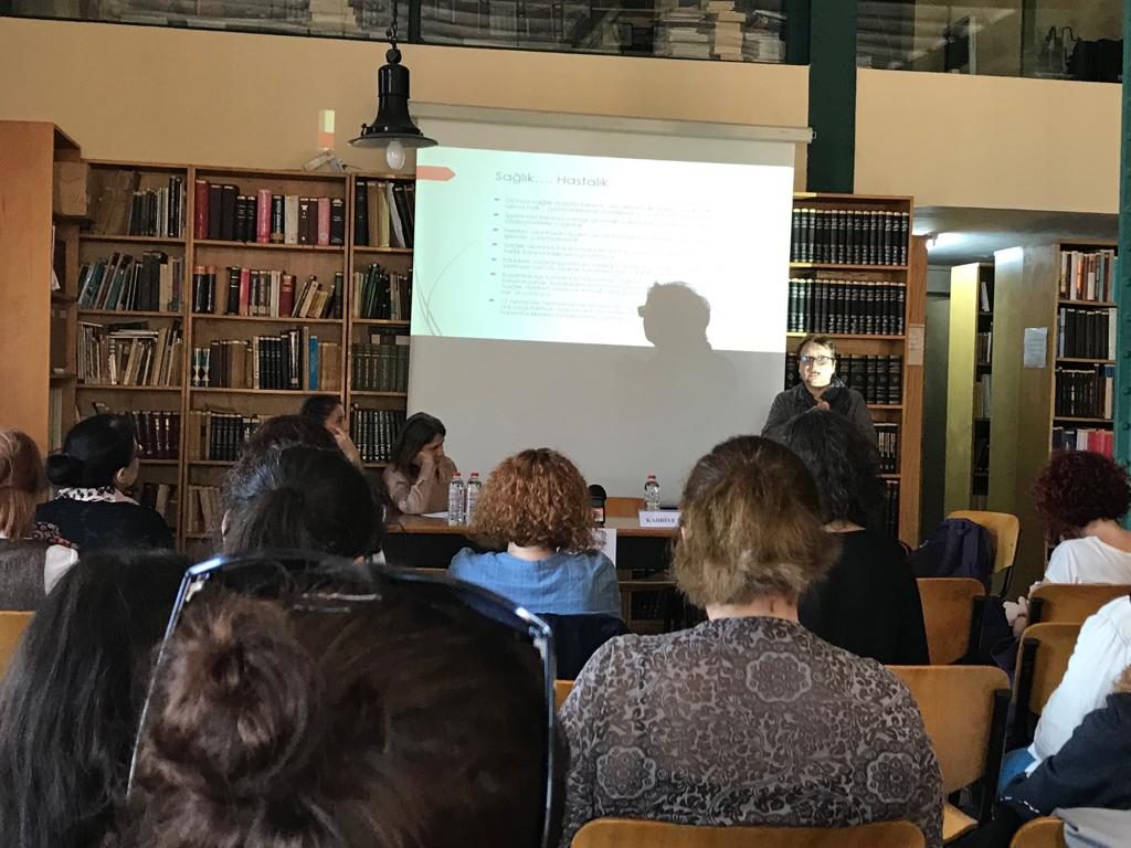 Panel, Necla Akgökçe’nin sunumu ile başladı. Yaygın iş sağlığı ve iş güvenliği anlayışının cinsiyet karşısında tarafsız görünmesine ve toplumsal cinsiyet farklılıklarını göz ardı etmesine dikkat çeken Necla Akgökçe kadın işçilerin ve erkek işçilerin iş güvenliği arasındaki farkı Alman İşçi Sendikası (IGMetall)’nın yaptığı bir araştırma ile örneklendirdi: Araştırmaya göre erkek işçilerden “sağlık” kavramını tanımlamaları istendiğinde “kendini iyi hissetme” gibi WHO’nun sağlık tanımına yakın bir cevap alınırken kadın işçiler aynı soruyu “ağrı ve sakatlık durumunun olmaması” gibi daha dezavantajlı bir konumdan yanıtlıyor. Necla Akgökçe kadın işçiler için yeterli koruma önlemi bulunmamasını aşamalı bir kısır döngü olarak şematize etti. Bu şemaya göre: Kadınların yaptıkları işler kolay ve risksizdir önyargısı ile kadına özgü koruma tedbirlerinin gelişmesi engelleniyor, kadın işçilerin maruz kaldıkları riskler ölçülmüyor, kadınların hastalıkları hormonal yapılarına bağlanıyor, tespit edilmediği için görünür kılınmayan meslek hastalıkları da ön yargıyı artırarak süreci başa çeviriyor. Necla Akgökçe’nin dikkat çektiği diğer konular şöyleydi: