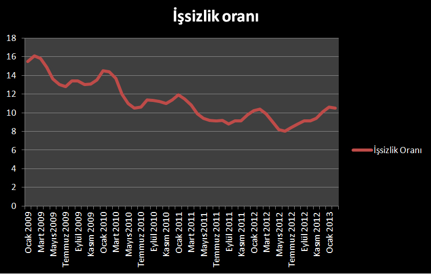 İnşaat sektörü istihdamındaki grafikte görülen 2009 sonrası artışla paralel olarak işsizlik oranlarında 2009 itibariyle düşüş var. Bu iki grafik arasındaki paralelliğin ne kadar önemli olduğu tartışmalı tabi ki. Birincisi, istihdam verileri kayıtlı işçiler üzerinden alınıyor. İnşaat sektörü kayıtsız çalışmanın en yaygın olduğu sektör. İkincisi, istihdam grafiği sayı cinsinden diğeri ise nüfusa olan oran. Sadece aradaki yükselme ve alçalmaya dair birkaç yorum yapılabilir.