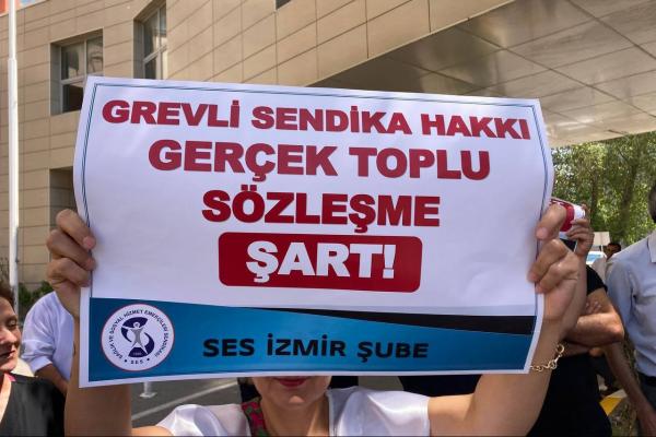 İzmir Atatürk Eğitim ve Araştırma Hastanesinde çalışan Sağlık ve Sosyal Hizmet Emekçileri Sendikası (SES) üyesi sağlık emekçileri, kamu emekçileri ve emeklileri 2024-2025 yılları toplu sözleşmesi taleplerine dair basın açıklaması düzenledi. Başhekimlik önünde gerçekleştirilen açıklamada basın metnini SES İşyeri Temsilcisi Neşe Kaya Kalender okudu.