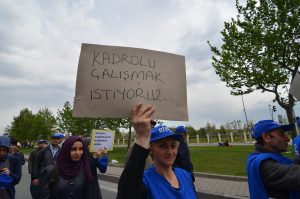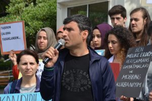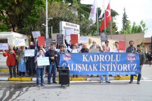 Yıllardır aynı hastanede yol ve yemek ücretlerinin ödenmesi, kıdem tazminatı, işçi sağlığı ve iş güvenliği, kadrolu çalışma için mücadele yürüten taşeron işçiler haklı taleplerini 1 Mayıs’ta da dile getirdi. Geçtiğimiz yıl hastanenin yemekhane skandalını ifşa ettiği için işten atılan hastanenin İşçi Sağlığı ve İş Güvenliği baştemsilcisi Cemal Bilgin kısa bir konuşma yaparak hastanede yürüttükleri mücadelenin devam ettiğini, yıldırmalara ve baskılara boyun eğmeyeceklerini söyledi.