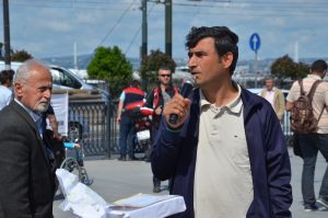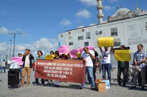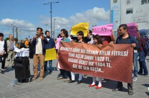 Ücretlerinin düşüklüğüne dikkat çekmek, işyerlerinde yaşadıkları sorunları dile getirmek ve Ramazan’ı karşılamak isteyen DİSK Tekstil İşçileri Sendikası ve Taşeron İşçileri Yardımlaşma ve Dayanışma Derneği’nden işçi arkadaşlarımızla Eminönü’nde bir araya geldik. Diyanet İşleri Başkanlığı’nın bu yıl 16,00 TL olarak açıkladığı fitreyle dört kişilik bir ailenin aylık gıda masrafının 1920 TL olduğu ancak asgari ücretin 1404 TL olduğuna dikkat çekildi.