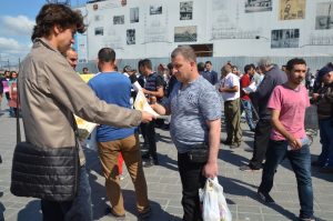 “Taşeron çalışma yasaklansın” “İşçinin orucu 12 ay” ” Alınterimizin karşılığı asgari ücret mi?” “Çalışan biz, yapan biz, kim bu doymak bilmeyen edepsiz” dövizleriyle Yeni Camii önünde eylemimizi gerçekleştirdik. Taş-iş Der’den Cemal Bilgin taşeron işçilerin sorunlarından bahsederek fitreye dahil edilmeyen fatura, sağlık, eğitim masraflarının asgari ücretle nasıl karşılanacağını bilmediklerini söyledi. Hazırladığımız imsakiyeleri ve hurmaları dağıttıktan sonra basın açıklamasını okuduk.
