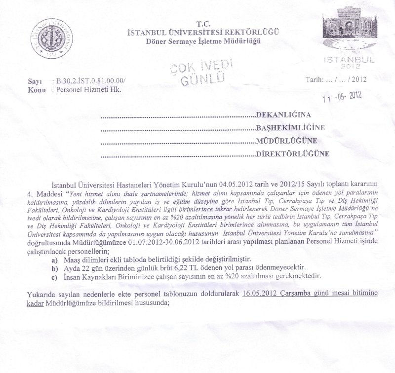 İstanbul Üniversite Hastaneleri Yönetim Kurulu yeni bir karar alarak, yeni ihaleyle birlikte, 1 Temmuz’dan sonra taşeron işçilerin yüzde 20’sini çıkartacağını, yol ücretlerini keseceklerini, ücretleri en az yüzde 5 olmak üzere düşüreceğini açıkladı.