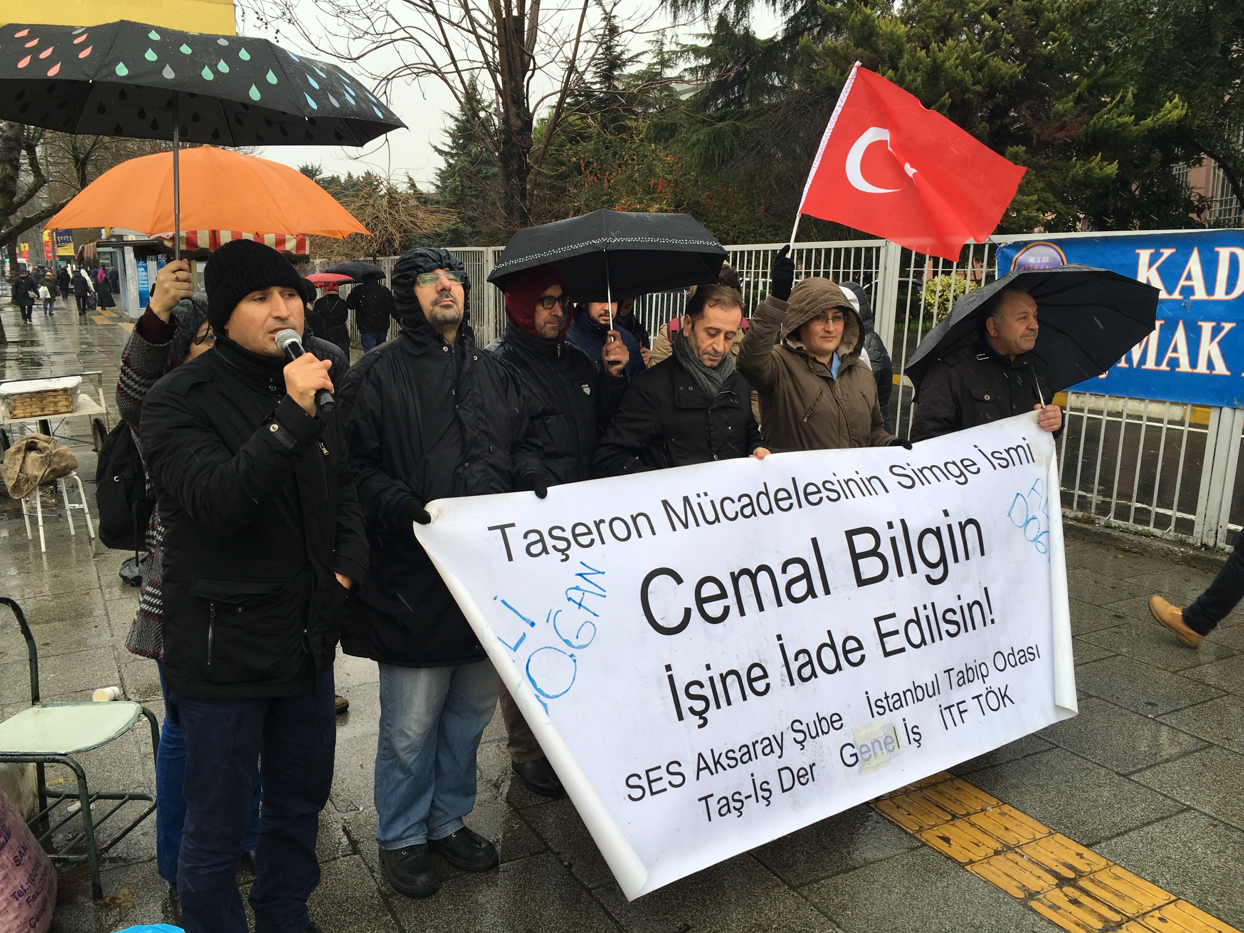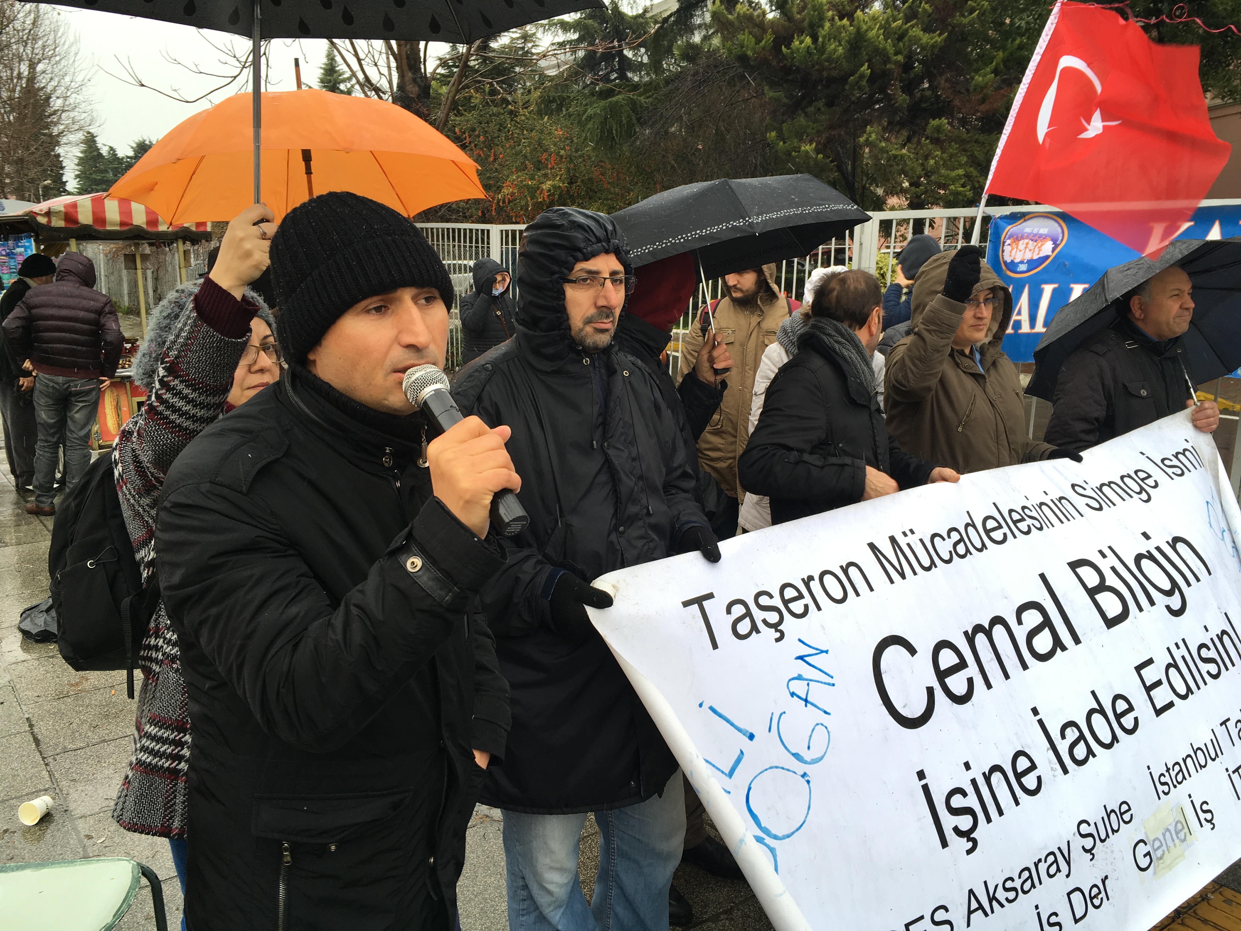 5 Eylül günü işten atılan, o tarihten beri de işine geri dönme mücadelesini işçi arkadaşlarıyla birlikte sürdüren Cemal Bilgin bugün de kar kış, yağmur çamur demeden İstanbul Tıp Fakültesi (Çapa) Hastanesi önündeydi.