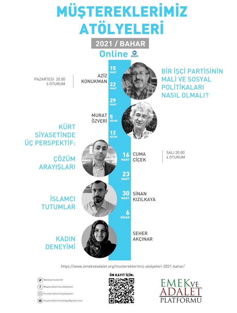 Katılımcılarıyla birlikte insanlığın müşterek mirasını incelemek için 2018 yılında kurulan Müştereklerimiz Atölyelerinin altıncı dönemini gerçekleştiriyoruz. Tüm dünyayı etkisi altına alan COVİD – 19 salgından dolayı atölyelerimizi çevrimiçi olarak zoom üzerinden yapacağız. 2021 Bahar döneminde iki farklı atölyede beş farklı konuşmacı yer almaktadır. Aziz Konukman ve Murat Özveri ile Bir İşçi Partisinin Maliye ve Sosyal Politikaları Nasıl Olmalı? Cuma Çiçek, Sinan Kızılkaya ve Seher Akçınar ile Kürt Siyasetinde Üç Perspektif: Çözüm Arayışları, İslamcı Tutumlar ve Kadın Deneyimi’ni konuşacağız.