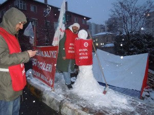 K: Yemek boykotlarını yaparken, biz sendikaya hani bir baskınlık olarak değil de…Ekmek arası bir şeyler getirin, böyle bir şey yapacağız, dedik. Bize bildirileri bastırın getirin, Ümraniye’de Mecidiyeköy’de bildiri dağıtacağız dedik.