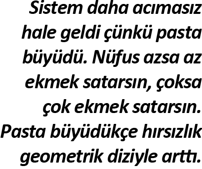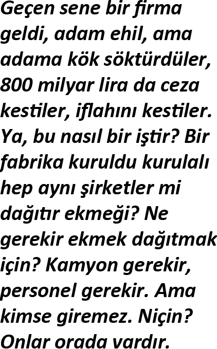 Hiç kimse de ihaleye inanmaz. A, birileri çıkar deli dolu, rakam atar, şunu atar bunu atar, onun da iflahını keserler. Eğer bir ihalede, istemedikleri bir adam o ihaleyi almışsa, ona kök söktürürler, para ödemesini geciktirirler, kontrol mühendisiyle başını ağrıtırlar, sonunda illallah der, çeker gider. Size şimdi net bir örnek veriyorum. Bir araştırma yapın. Halk Ekmek Fabrikaları kuruldu kurulalı, İstanbul’un ekmeğinin dağıtımını kimler yapar? Malum firmalar. Geçen sene bir firma geldi, ben bu işi yapabilirim, ehil, adama kök söktürdüler, 800 milyar lira da ceza kestiler, iflahını kestiler. Ya, bu nasıl bir iştir? Bir fabrika kuruldu kurulalı hep aynı şirketler mi dağıtır ekmeği? Ne gerekir ekmek dağıtmak için? Kamyon gerekir, personel gerekir. Ama kimse giremez. Niçin? Onlar orada vardır. Geçen sene giren arkadaşlar perişan oldular, geri çıktılar. İşi mi yapamadılar? Onlardan daha güzel yaptılar. Bir bahane bulur, bir ceza keser, iki ceza keser, üçüncüsünde Kamu İhale Kurumu’nda yasaklı duruma getirirler. Sistem daha acımasız hale geldi çünkü pasta büyüdü. Nüfus azsa az ekmek satarsın, çoksa çok ekmek satarsın. Pasta büyüdükçe hırsızlık geometrik diziyle arttı.