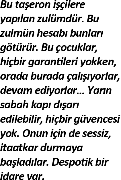 Ne oluyor sonuç itibariyle? Şu anda işçi hiç sesini çıkaramaz. Ne hak talep edebilir, ne başka bir şey. Kaldı ki, şimdi öyle bir hale getirildi ki, bu BİT’lerde aykırı bir fikir söylemek dahi zorlaştırılmış durumda.