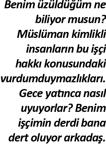 Benim üzüldüğüm ne biliyor musun? Müslüman kimlikli insanların bu işçi hakkı konusundaki vurdumduymazlıkları. Gece yatınca nasıl uyuyorlar? Benim işçimin derdi bana dert oluyor arkadaş. Net söylüyorum, acayip şekilde dertleniyorum. Belediyeye dava açıp diyorum ki: Ben bu işçiye tazminat ödeyeceğim, bana tazminat ver. Size bir örnek vereyim. Böyle bir davanın bulunduğu yerde böyle bir iş yaptım. İşçiler belediyeyle davalık. Bunun şahitleri var. Gerekirse bu şahitlerin hepsini çağırabilirim, hâlâ görevdeler. Bu BİT hâlâ yerinde duruyor, hâlâ işçi çalıştırıyor. İkinci sene ihaleyi bana vermek için, beni desteklemek için, işçilerle kendilerinin arasında olan problemde kendilerinden taraf olmamı talep ettiler, çünkü onlar taşeronlaştırmış işleri, müteahhite belediyeden vermişler, işçiler dava açmış belediyeye, ayrılanlar var, haklarını talep ediyorlar. Bana dediler ki, siz mahkemeye mecburen gideceksiniz, önümüzdeki yıl ihaleyi istiyorsanız, bu mahkemede belediye BİT’i lehine şahitlik edin. Ben de dedim ki, ben doğrunun ifadesini vereceğim ve sorumluma talimat verdim: Gidiyorsun, evet bu işçinin söylediği doğrudur, bu işçiler bize belediye tarafından verilmiştir, diyorsun. Böyle dediğimiz için o çocuklar tazminatlarını çatır çatır kazandı.
