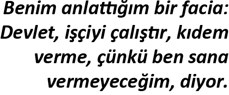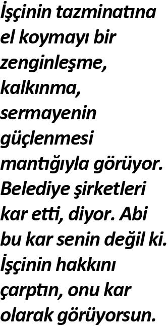 Sistem buna müsaade ediyor. Bunu bir zenginleşme, bir kalkınma, sermayenin güçlenmesi mantığıyla görüyor. Belediye şirketleri kâr etti, diyor. Bu kâr senin değil ki. İşçinin hakkını çarptın, buraya getirdin, kâr olarak görüyorsun. Örneğin demin bahsettiğimiz şirket 10-15 trilyona yakın bir tazminat ödedi. Eğer o belediye şirketi o 10-15 trilyonu ödemese sene sonunda 10-15 trilyon kâr gösterecek. Aslında işçinin hakkı. Biz hangi paylaşımcılığından, hangi işçi hakkından söz ediyoruz? Müslümanların emek, üretim araçları, üretim ilişkileri, böyle bir dertleri olmamış. Bunları görmüyorlar. Böyle bir şey yok. “Ben,” diyor, “ona iş verdim. O da benim kölemdir, köle gibi çalışacak.”
