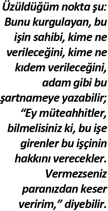 Bunun da müşahhas örneğini vereyim. Bir ihalede biz de kıdem ve ihbarı hesap etmeden fiyat attık yani ihalenin çıplak ücretini ve işi aldık. Sene sonunda işçiler bize dava açtılar. Dedim ki, haklı bu işçiler. Hukukçuma danıştım, dedi ki, sen de belediye şirketine dava aç ve açtık. Bize, “böyle bir ödeme kalemimiz yok,” dediler. Yani devletin, taşeronlaştırmadaki, onların deyimiyle özelleştirmedeki ana fikri kıdemsiz, ihbarsız işçi çalıştırmak. Tazminat miktarını bir kazanç haline getirmek, kapitalin içine sokmak için yaptılar bunu. Yani kamunun bu ihale şartnamesini düzgün çıkarmadığı yerden başlıyor bu iş. Bunu şu ana kadar hiçbir siyasimiz, bu konularla alakalı hiç kimse gündeme getirmedi. “Efendim, işçi kıdemsiz ihbarsız ne yapacak?” Ya kardeşim, Kamu İhale Kanunu çıkarken neredeydiniz?