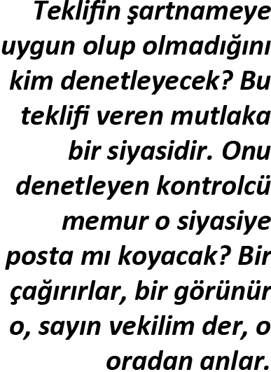 Tabii ki uymuyor. Ama şartnameye uygun olup olmadığını kim denetleyecek? Bu teklifi verenin arkasında bir siyasi vardır. Onu denetleyen kişi bu siyasiye posta mı koyacak? Zaten o siyasi gelip Daire Başkanı’nın yanında bir oturur. O memuru, o kontrolcüyü bir çağırırlar, bir görünür o, sayın vekilim der, veyahut da bir şey der, o oradan anlar. Mehmet Abi’nin bir işi var, bir bakıver, derler. Eli titrer, çünkü yerinden olacağını bilir. Ha, buna direnen arkadaşlar var mı? Var. Onlara da hiçbir görev vermezler. Pasiftir onlar belediyede. Şu anda belediyede pasif görevde onlarca kişi vardır. Sabah giderler, otururlar, gazete okurlar, kötü bir masa vermişlerdir. Nedir? İşe yaramadıkları için değil. O çarkı döndürmedikleri için, o çarkta bir problem çıkaracakları için. Sistem böyle. İç kanaması var sistemin. Sistem bu kanamaya ne kadar dayanır bilemiyorum.