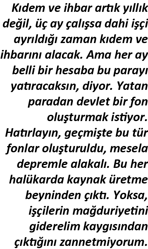 Şimdi sizin gibi sivil toplum örgütleri taşeronlaşma diye bağırınca devlet ikinci bir akıl icat etti. Şunu net söylüyorum. Şimdi tasarı olarak görüşülen yasa, yine önceki yasadaki akla sahip. Devlet, görüşülen yasayı işçinin lehine gibi gösteriyor. Ama oradan bir fon, bir kaynak oluşturmak için böyle yapıyor. Nedir yasa tasarısı? Bakan açıkladı. Kıdem ve ihbar artık yıllık değil, üç ay çalışsa dahi işçi ayrıldığı zaman kıdem ve ihbarını alacak. Ama her ay belli bir hesaba bu parayı yatıracaksın, diyor. Bir işçi 10 ay veya 10 yıl çalışsa, hiç ayrılmadan, yatan paradan devlet bir fon oluşturmak istiyor. Hatırlayın, geçmişte bu tür fonlar oluşturuldu, mesela depremle alakalı. Devlet bu paraları biriktirip sonra bunları ne yapıyor, halka işçilere veriyor mu, takip etmek lazım. Bu her halükarda kaynak üretme beyninden çıktı. Yoksa, işçilerin mağduriyetini giderelim kaygısından çıktığını zannetmiyorum. Yine de, böyle olmasına rağmen, eskisinden bir nebze daha iyi, iyi işletilebilirse.