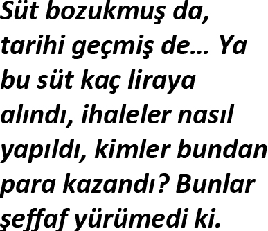 Şu süt ihalesini kim aldı? Büyük firmalar değil. Mesela bir Kayseri firması var. Süt işine ne zaman girdi, bir bakın bakalım. Bana göre son yılların en güzel buluşu, Twitter’da “sütü bozuklar” diye girmişler. Doğru, “sütü bozuklar”, başka anlam yüklemeye gerek yok! Bu sütler bozuktu anlamına gelir. Bu sütler nasıl, hangi ihale tekniğine göre, hangi fiyatlarla alındı? Hiç kimse konuşmuyor bak dikkat edersen. Süt bozukmuş da, tarihi geçmiş de… Ya bu süt kaç liraya alındı, ihaleler nasıl yapıldı, kimler bundan para kazandı? Bunlar şeffaf yürümedi ki. Beni Kamu İhale Kurulu Başkanı yapın, mevcut Kamu İhale Kanunu’na göre ben o ihaleyi istediğim kişiye veririm. Çünkü elli tane fuzuli evrak doldurtturuyor içine. Bu evraklarla ihalenin gideceği firma tanımlanıyor.