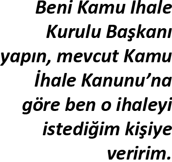 Bütün bunlardan kastım şu: Bugünkü kamu ihale tekniğine göre, siz zannediyorsunuz ki, ihale denince düzgün bir rekabet oluyor… Türkiye Cumhuriyeti Anayasası’nda ne yazıyor? “Demokratik, laik ve sosyal bir hukuk devletidir.” Aynı onun gibi, Kamu İhale Kurumu’nun internet sitesine girin, Kamu İhale Kanunu’nda yazar: “Temel İlkeler: Madde 5. 1. Saydamlık, 2. Rekabet, 3. Kamu menfaati…” Bana göre hiçbirisi gerçekleşmez. Bizim Kamu İhale Kanunu aynı Türkiye Cumhuriyeti Anayasası’na benzer. “Herkes eşittir,” der Anayasa, “ancak…” diye başlar, “askerler şundan yargılanamaz, devlet memurları bundan yargılanamaz, şu şöyle olamaz…” Ortada kala kala köylü çiftçi işçi kalır. Aynı, Kamu İhale Kanunu da başlar, “saydamlık, rekabet…” Yani iyi, doğru fiyat veren, hesabını düzgün yapan… Ve “kamu menfaati”. Bu laf o kadar büyük ki! Bizim kamu menfaatinden anladığımız nedir? Halkın menfaatidir. Spesifik olarak devletin menfaati deseler dahi, kamu menfaati bu cümlede olumlu olarak kullanılabilir. Ama hiçbirisi gerçekleşmez. Hemen altından başlar: “İstisnalar”. Buna onlar teknik tabirle 3G derler. “Doğrudan Temin: Madde 22. Aşağıda belirtilen hallerde ihtiyaçların ilân yapılmaksızın ve davet usulü ile doğrudan temini yöntemine başvurulabilir.” Acil, sağlık… Bugün bir Kırım Kongo Kanamalı Hastalığı (kene vakası) çıksa bu memlekette, nitekim de çıktı, kendi sektörüm, Sağlık Bakanlığı bunu acil koduna sokar, istediği ilacı istediği kişiden alabilir. Demek ki orada geçerli değil.