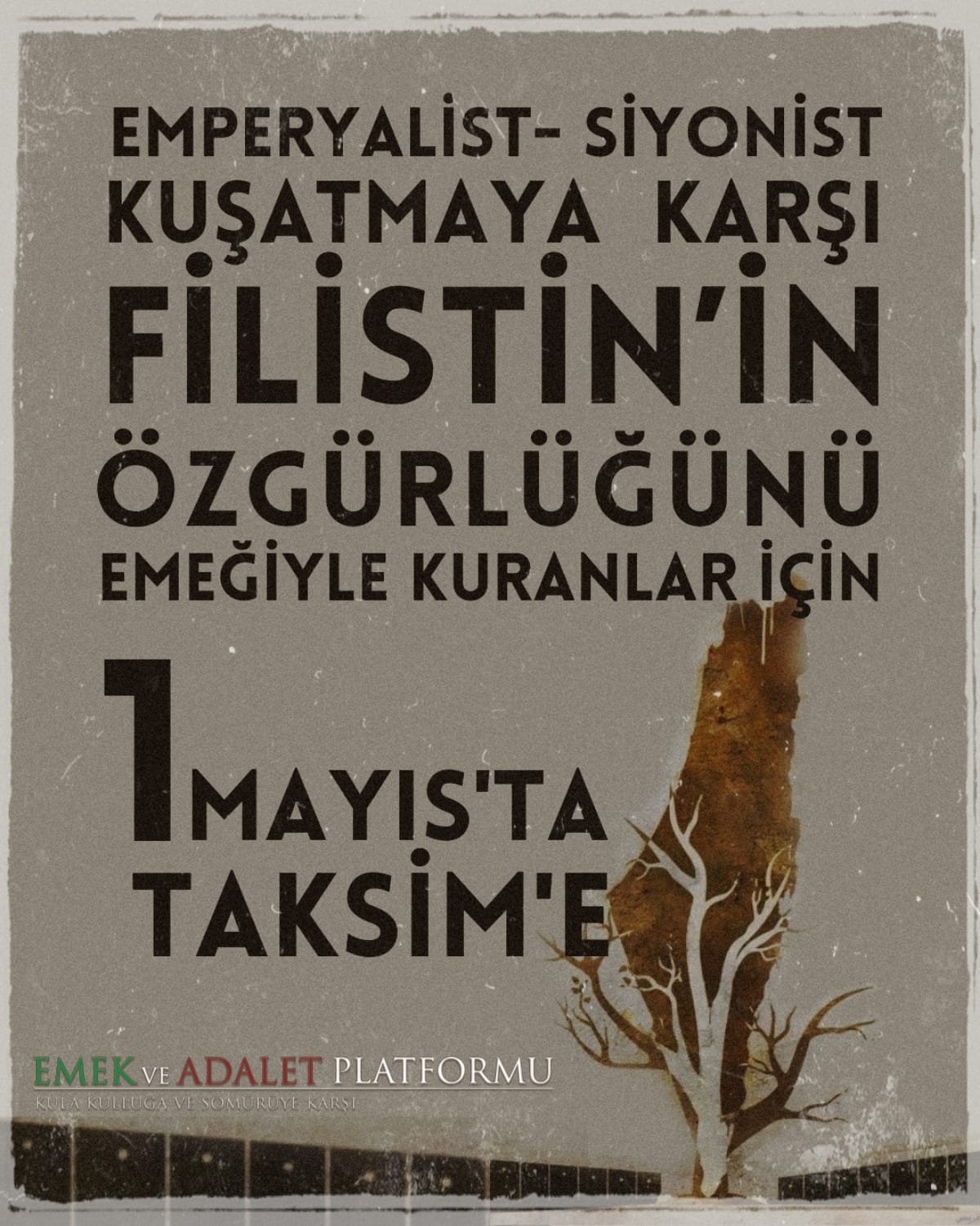 Kemal Türkler’in deyimiyle, “Dünyada her şeyi yapan işçiler durursa dünya da durur. Uçaklar durur, gemiler durur, fabrikalar durur, bütün vasıtalar durur.” Bizler de kanımızı emen bu düzeni durdurmak, emperyalist-siyonist kuşatmanın yolunu kesmek için, kulla kulluğa ve sömürüye karşı çıkmak için tüm dostlarımızı 1 Mayıs’ta Taksim’e çağırıyoruz. Alın terimize ve hakkımız olana sahip çıkmak için hesap sormaya geliyoruz!
