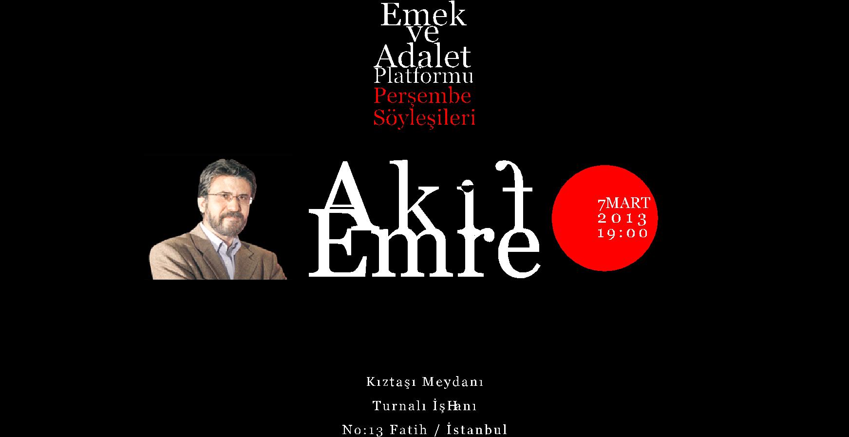 7 Mart Perşembe günü büromuzda Akif Emre ile yaptığımız söyleşinin dökümünü sizlerle paylaşıyoruz. Emek Adalet: Bunca zamandır planladığımız, niyet ettiğimiz ama bir türlü gerçekleştiremediğimiz sohbeti gerçekleştireceğiz bu akşam. Akif Emre ile beraberiz… Akif Abi...