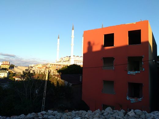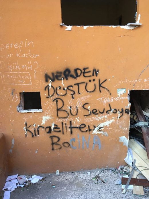 Mahalleli bir amcanın refakatinde yıkıntılar üzerinde dolaşıyorum. Güneş batma meylinde. Uzaklarda boğazın görüldüğünü söylüyorlar, boğazı görüyorum. Ayaklarımın altında seccadelerden yüzeye çıkan parçalar var. Kur’anı Kerimlerin yıkıntılar altında kaldığını ve yıkım ekibi çalışırken elektrikler kesik...